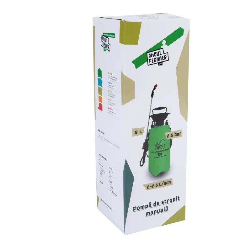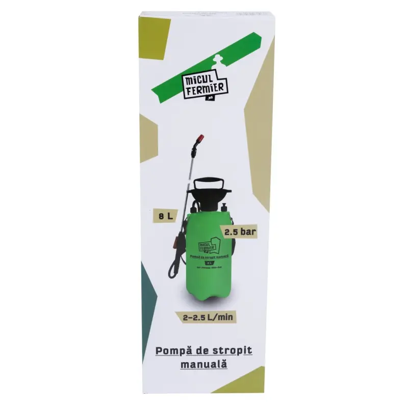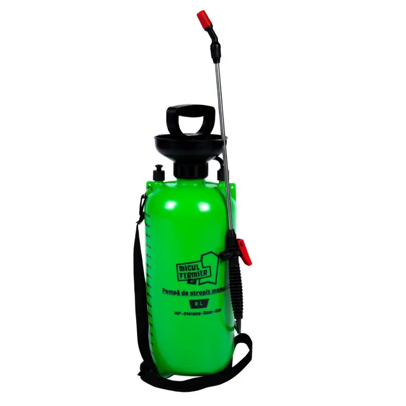 Pompa de stropit manuala, Micul Fermier 8L MF-PM1008-S001-G01 este potrivita pentru pulverizarea de solutii apoase care contin: pesticide (erbicide, fungicide, insecticide, acaricide) pentru combaterea buruienilor, bolilor si daunatorilor; ingrasaminte lichide (biostimulatoare, fertilizante, aport de calciu, fier, zinc, potasiu) pentru ingrijirea plantelor, florilor, arbustilor; detergenti pentru curatarea usoara a unor suprafete sau geamurilor; apa de ploaie pentru udari; substante pentru dezinsectie si dezinfectie. Necesara in gospodarii, gradini de legume, livezi de pomi fructiferi, vii, suprafete agricole, grajdurile de pasari sau animale. Nu este permisa utilizarea pompei pentru pulverizarea de: substante chimice agresive din clase industriale; substante explozive; solventi, substante caustice cu autoincalzire; substante corozive; agenti de pulverizare care nu sunt aprobati la comercializare;