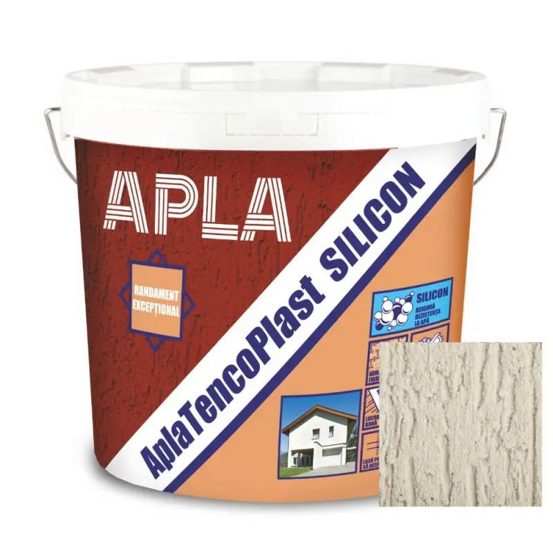 Tencuiala decorativa siliconica Apla TencoPlast structurata cu granulatie de 1,5 mm este potrivita pentru finisarea si protectia peretilor exteriori si coloanelor. O poti utiliza pentru sistemele termoizolante, suporturi minerale precum tencuielile de var-ciment si beton. Aceasta este fabricata pe baza de copolimeri acrilici in dispersie apoasa, granule de marmura naturala, pigmenti, exenderi, aditivi si silicon. Armatura din fibre de sticla ii confera rezistenta sporita. Avantaje: • aplicare usoara si lucrabilitate excelenta • rezistenta la factorii de mediu si inghet-dezghet • siliconul ii asigura rezistenta la apa • asigura protectia peretelui • nuante placute si rezistente in timp • finisare profesionala, cu structurare dreapta sau rotunda • poate fi nuantata Recomandari: Nu aplica tencuiala in conditii de vreme nefavorabile (ploaie, vant, ceata, radiaii solare directe, ninsoare). Nu este potrivita pentru zugraveli de var/huma, emailuri si vopsele pe baza de solvent sau lacuri si nici pentru suprafete orizontale pe care precipitatiile cad perpendicular. Pentru un rezultat uniform este recomandat sa folosesti un singur lot. Daca se folosesc mai multe loturi pentru acoperirea suprafetei se recomanda amestecarea acestora inainte de utilizare. La temperaturi de peste 30C este recomandat sa umezesti suportul. Omogenizeaza bine produsul inainte de utilizare. Curata uneltele de lucru cu apa, imediat dupa folosire. Aplicare: • Suporturile trebuie sa fie stabile, rezistente, curate, lipsite de praf si degresate. • Tencuielile, gleturile minerale si termosistemele noi se lasa sa se matureze, apoi aplica un strat de fond AplaTencoGrund in aceeasi nuanta cu tencuiala. • Suprafetele vechi sau vopsite anterior se curata de zugraveala neaderenta si se repara, apoi se aplica un strat de fond AplaTencoGrund in aceeasi nuanta cu tencuiala. • Aplica tencuiala nediluata, intr-un singur strat, fara intrerupere, dupa 24 de ore de la aplicarea stratului de fond. • Pentru aspectul "scoarta de copac", aplica tencuiala cu o gletiera de otel inoxidabil intr-un strat cu grosimea egala cu cea a granulatiei maxime a tencuieli. Structureaza cu o drisca din plastic prin driscuire pe drept (caneluri drepte) sau rotund (caneluri circulare) pentru granulatiile 1, 5 mm, 2 mm si 2,5 mm. • Pentru aspectul "bob de orez", aplica tencuiala cu o gletiera de otel inoxidabil intr-un strat cu grosimea egala cu marimea celor mai mari pietre din tencuiala, apoi structureaza cu drisca din plastic. Uscarea completa se realizeaza dupa 4 zile. Produsul este disponibil in ambalaj de 24 kg, in nuanta light gold (auriu deschis). Termenul de valabilitate este de 24 de luni de la data fabricatiei, depozitat in spatii inchise, ferite de intemperii, radiatii solare si surse de caldura, la temperaturi cuprinse intre +5C si +30C. Specificatii tehnice: • Brand: Apla • Utilizare: exterior • Numar straturi: 1 • Culoare: peach-puf • Cantitate: 24 kg • Compozitie: copolimeri acrilici in dispersie apoasa, granule de marmura naturala, pigmenti, exenderi, aditivi si silicon • Densitate:1,7 – 1,93 g/cm³ • Temperatura de aplicare: intre +10C si +30C • Timp uscare totala: 4 zile • Consum teoretic: "scoarta de copac" granulatie 1,5 mm: 1,6 – 1,8 kg/m2; "bob de orez" granulatie 1,5 mm: 2 - 2,5 kg/m2 • Diluant: apa • Tip suprafata: tencuieli minerale, sisteme termoizolatii